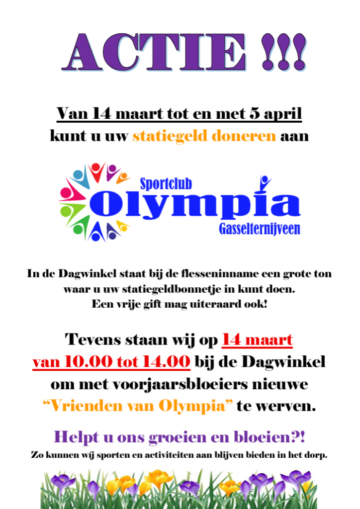| 14 maart | ACTIE voorjaarsbloeiers bij Dagwinkel – werven Vrienden van Olympia – |